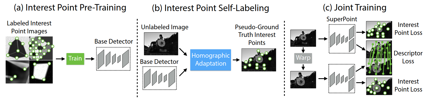 SuperPoint is a self-supervised framework for interest point detection and description in images, suitable for a large number of multiple-view geometry problems in computer vision. As opposed to patch-based neural networks, SuperPoint, as a fully-convolutional model, operates on full-sized images and jointly computes pixel-level interest point locations and associated descriptors in one forward pass. The model introduces Homographic Adaptation, a multi-scale, multi-homography approach for boosting interest point detection repeatability and performing cross-domain adaptation (e.g., synthetic-to-real). Besides, the model is able to repeatedly detect a much richer set of interest points than the initial pre-adapted deep model and any other traditional corner detector. The final system gives a state-of-the-art homography estimation results comparing the traditional feature extraction algorithms such as LIFT, SIFT and ORB.