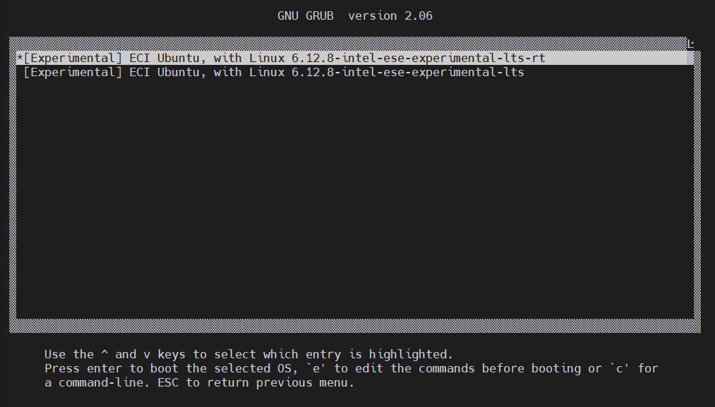 Note: Select Advanced Options for [Experimental] ECI Ubuntu to list [Experimental] ECI Ubuntu, with Linux 6.12.8-intel-ese-experimental-lts-rt for a real-time kernel or [Experimental] ECI Ubuntu, with Linux 6.12.8-intel-ese-experimental-lts for a generic kernel.