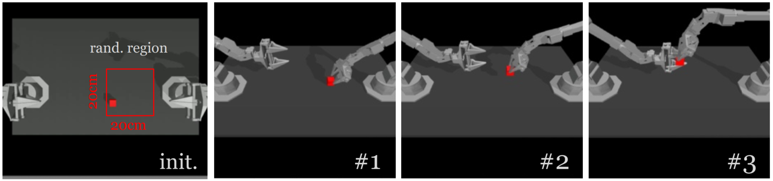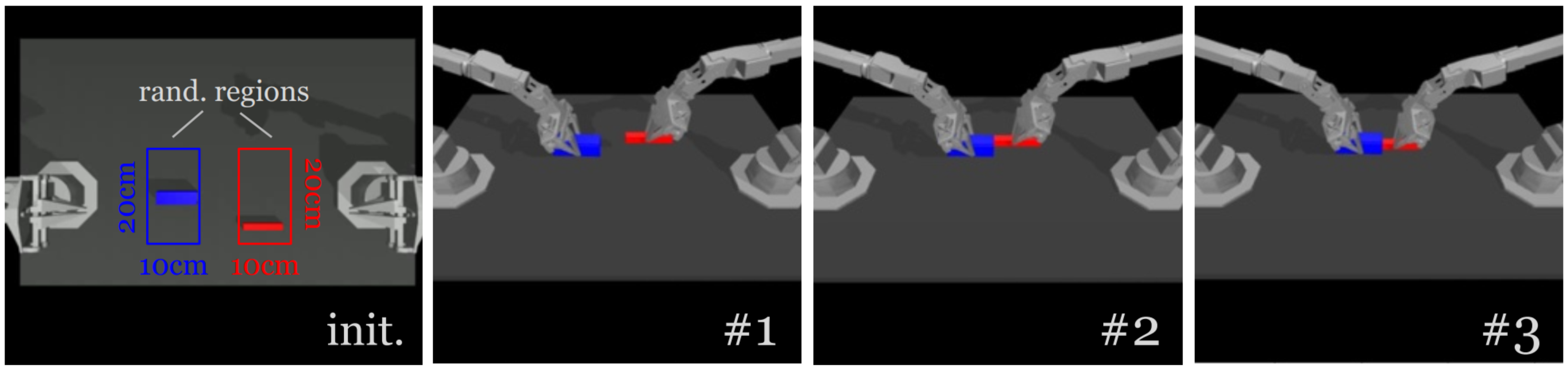 Default language instruction: “Use the right robot arm to pick up the red cube and transfer it to the left robot arm.”
