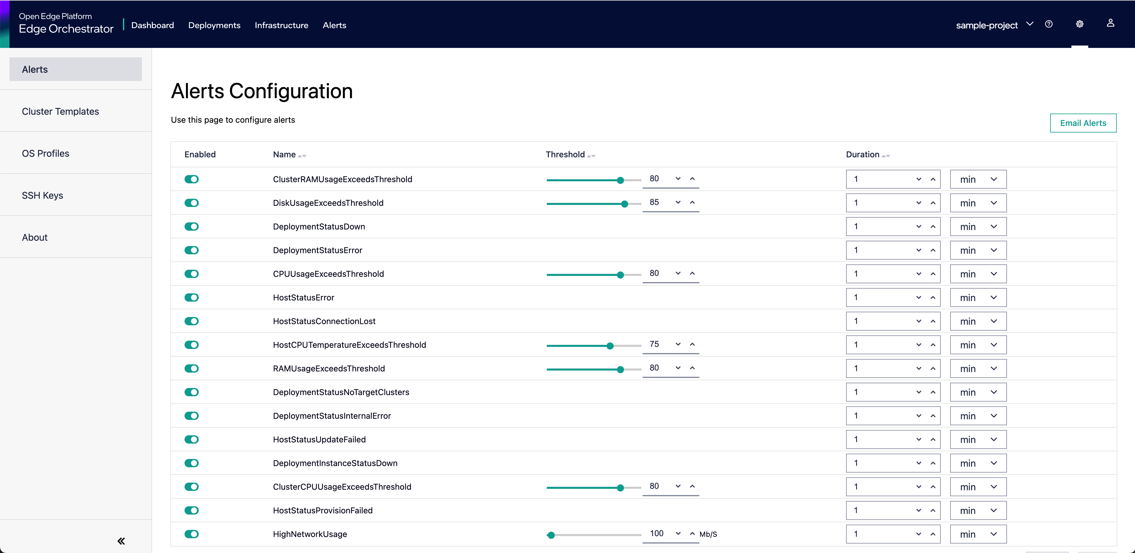 The User Interface (UI) provides support for configuring alerts under the Settings tab (gear icon in the top right corner of the UI). The UI allows users to configure thresholds and durations for alerts, as well as the email addresses to which alerts should be sent.
