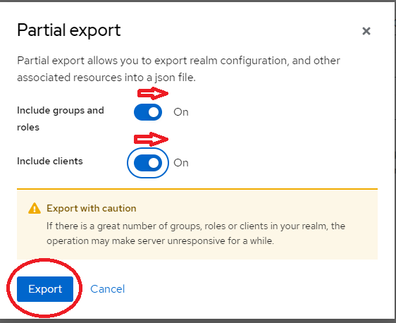 In the Partial export dialog, turn ON “Include groups and roles” and turn ON “Include clients” options, then choose Export.