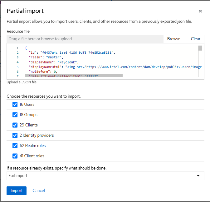 the realm-export.json backup file, and a dialog will open to choose what