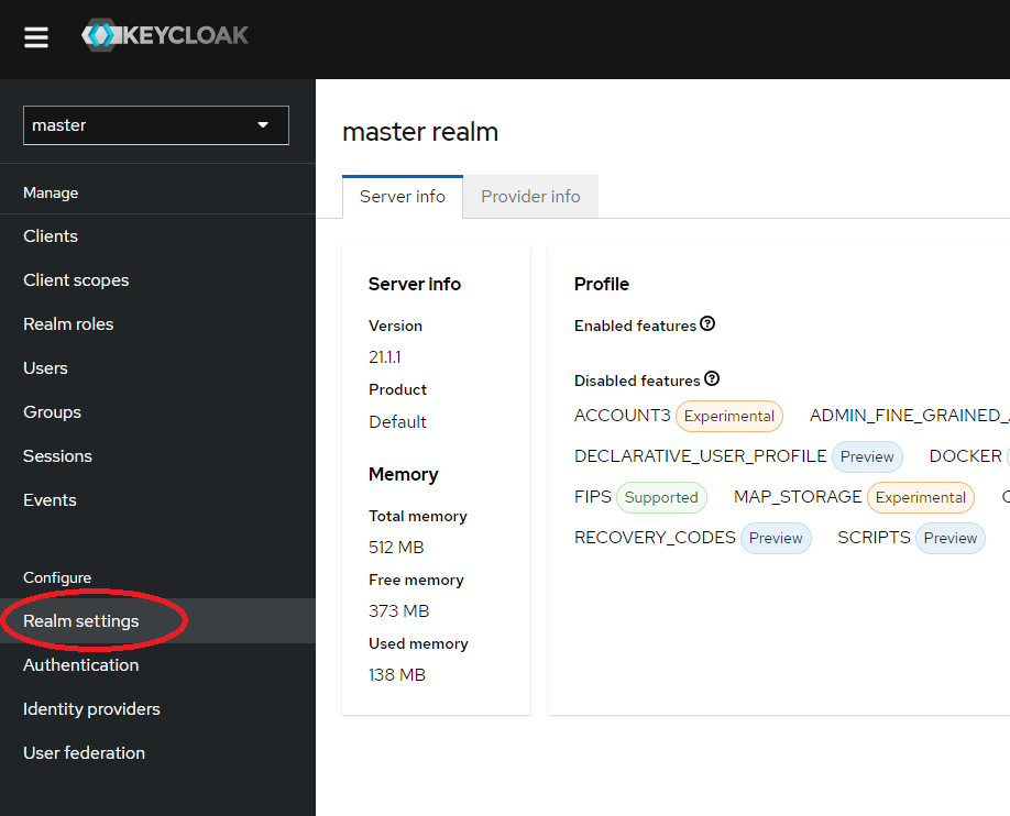 Open the Keycloak Admin console by navigating to the URL