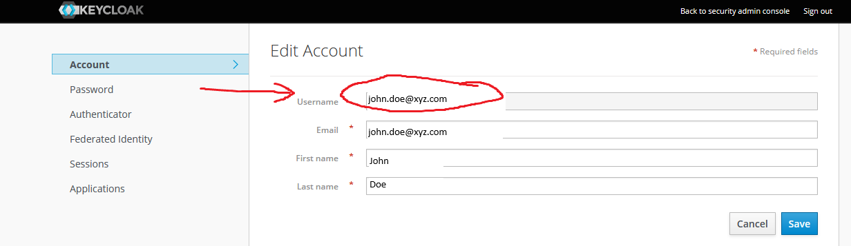 https://keycloak.<cluster_domain>/realms/master/account/password).Take note of the Username value under the Account tab: