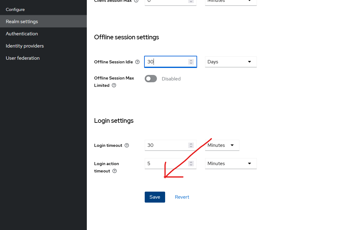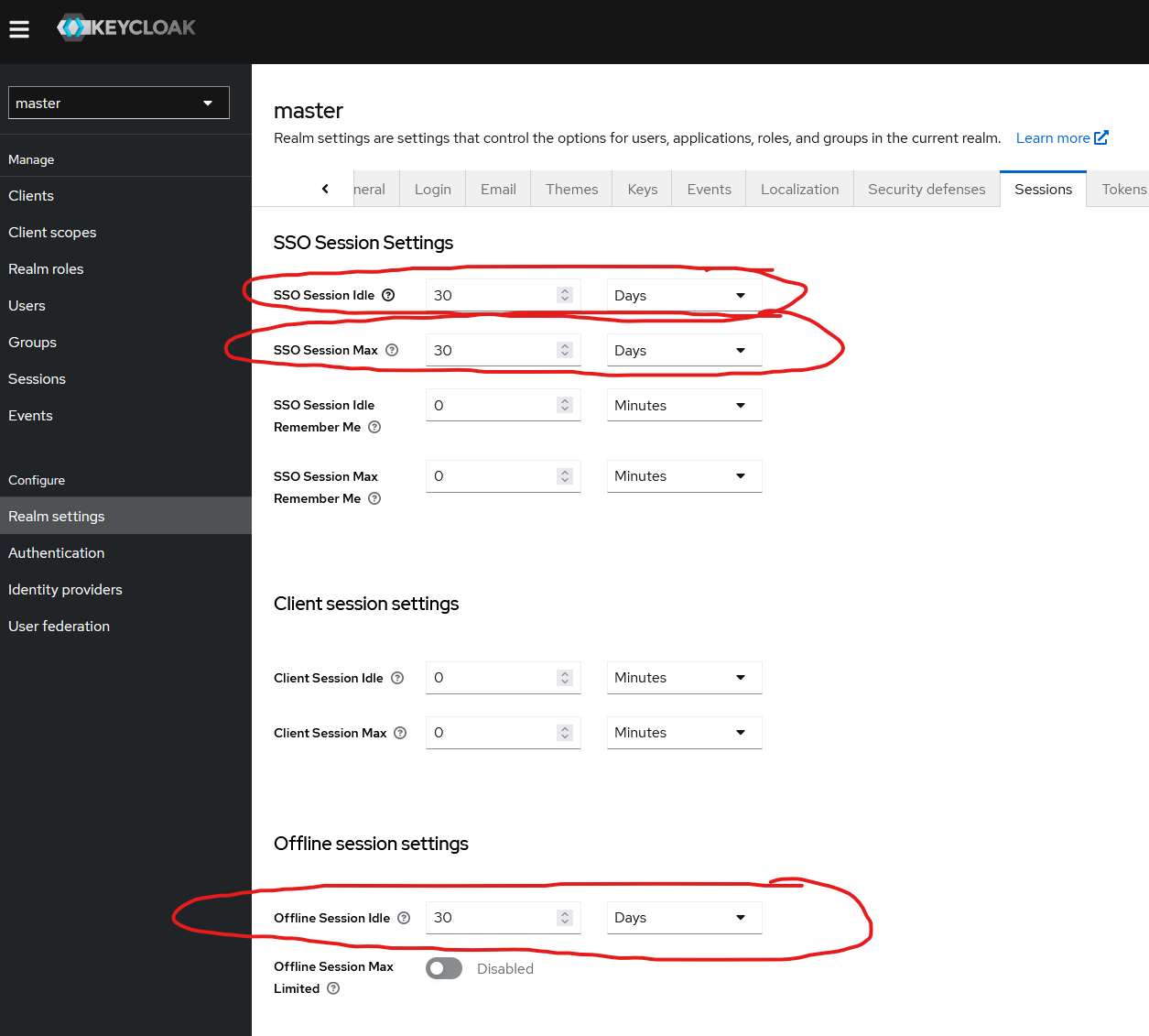 Change “SSO Session Idle”, “SSO Session Max” and “Offline Session Idle” to 30 days:
