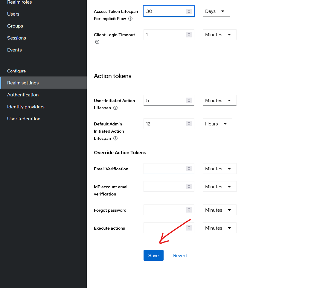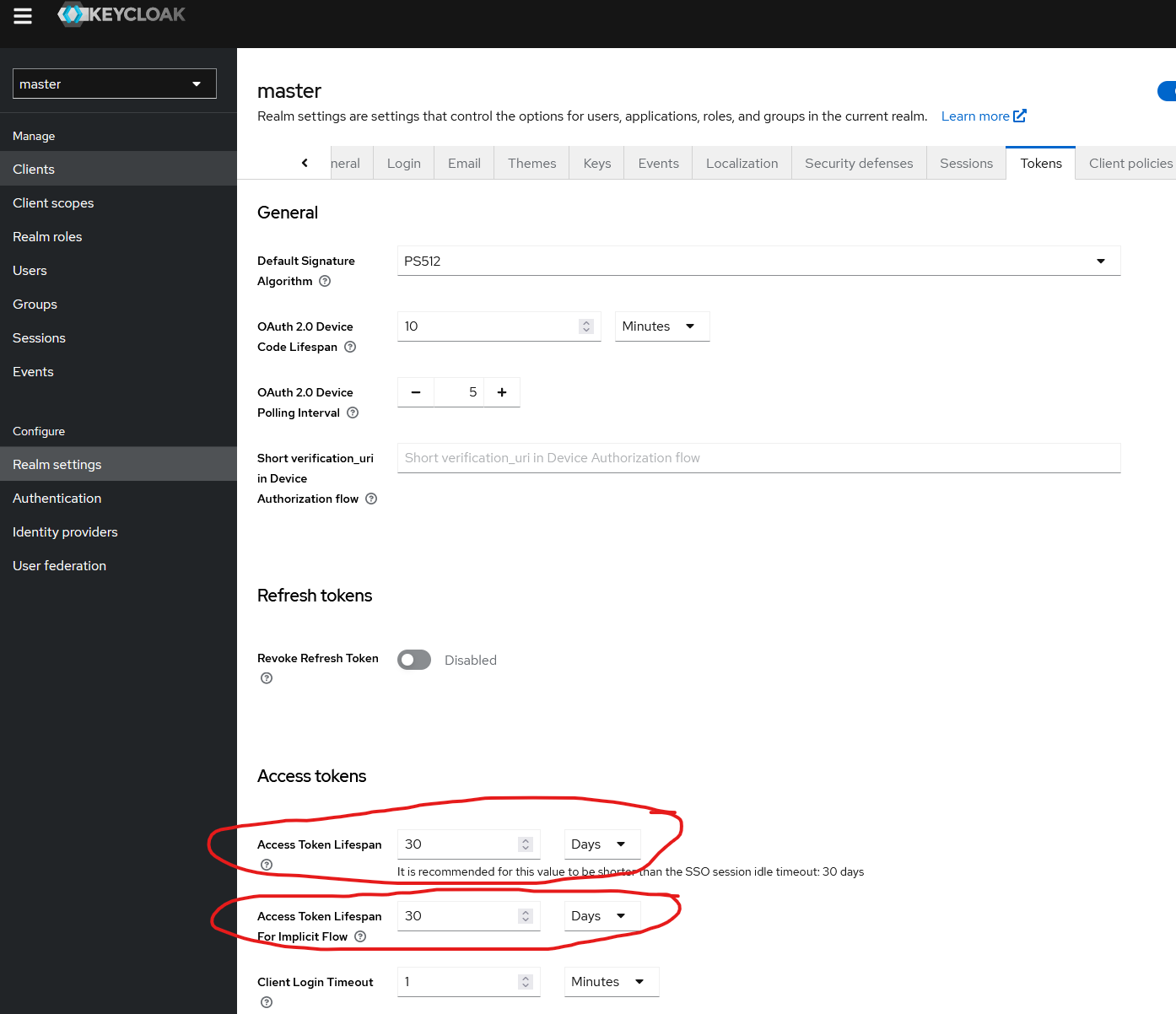Navigate to “Tokens” tab along the top and change “Access Token lifespan” and “Access Token lifespan for Implicit Flow” to 30 days: