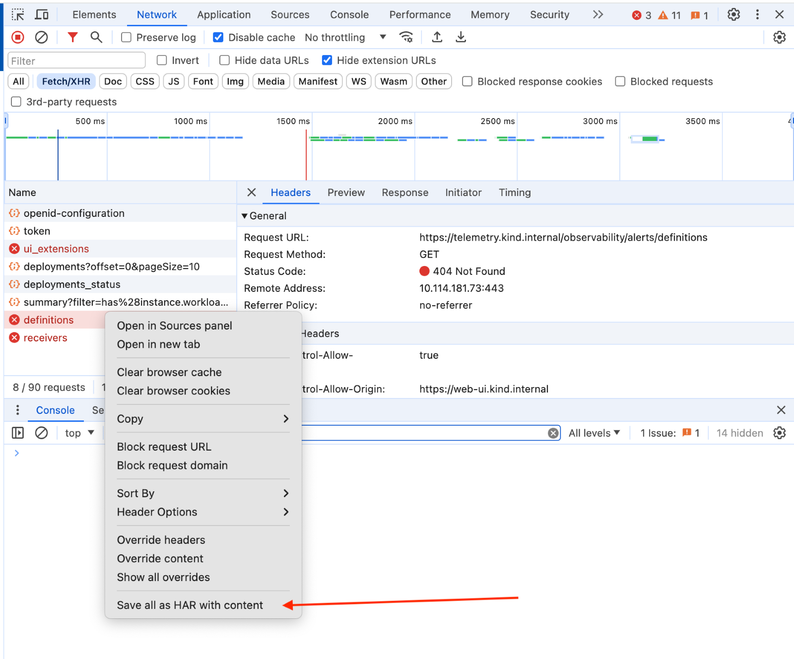 Note that to capture requests the console needs to be open before the request is sent