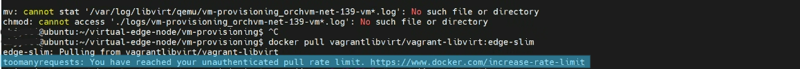 This section provides steps to resolve the “Docker rate limit exceeded” error encountered while creating VMs using Docker* Hub and Vagrant tool. This issue arises when the unauthenticated pull rate limit on Docker Hub is reached.