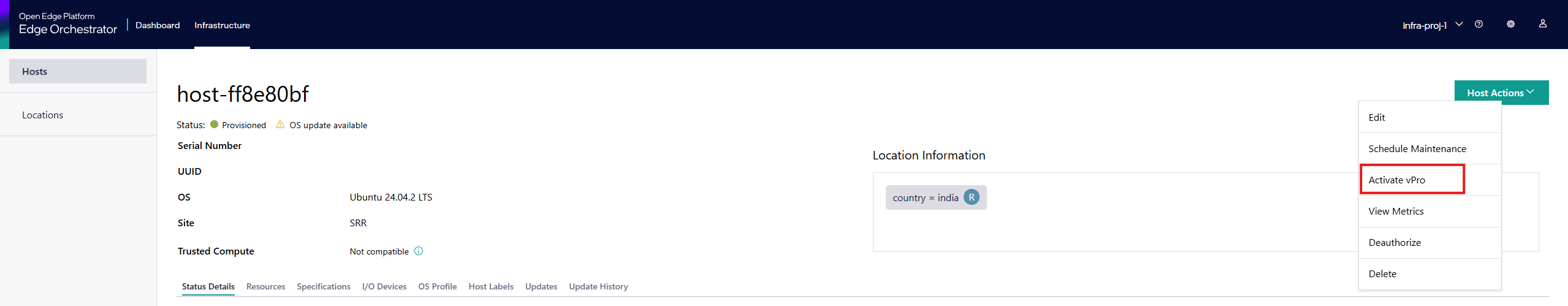 If the edge node is AMT/ISM-enabled, then only Intel® vPro® activation is enabled as part of Host actions.
