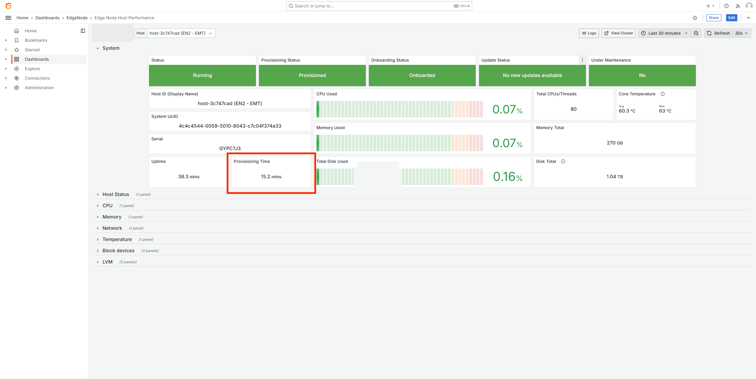 A panel for provisioning time is available in the Edge Node Host Performance Dashboard of Observability-UI. This metric provides insights into the time taken for a node to transition from the initial network configuration to having all necessary agents up and running.