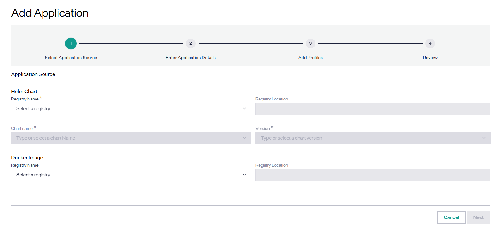 The Helm chart name and version will be available in the drop-down list if the registry is a Harbor* registry. If not, you will need to manually enter the chart name and version.