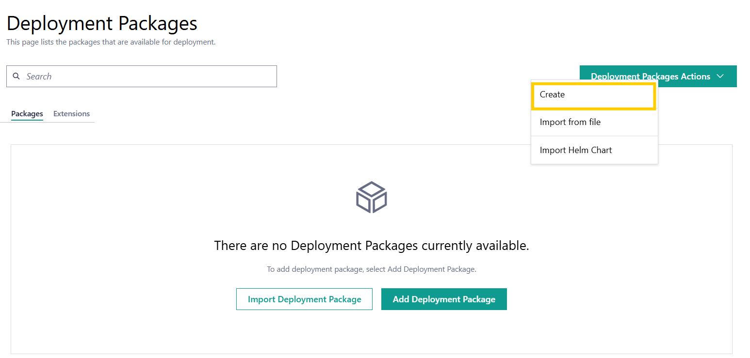 On the Deployment Packages page, click the Deployment Package Actions and select Create. The Create Deployment Package appears.