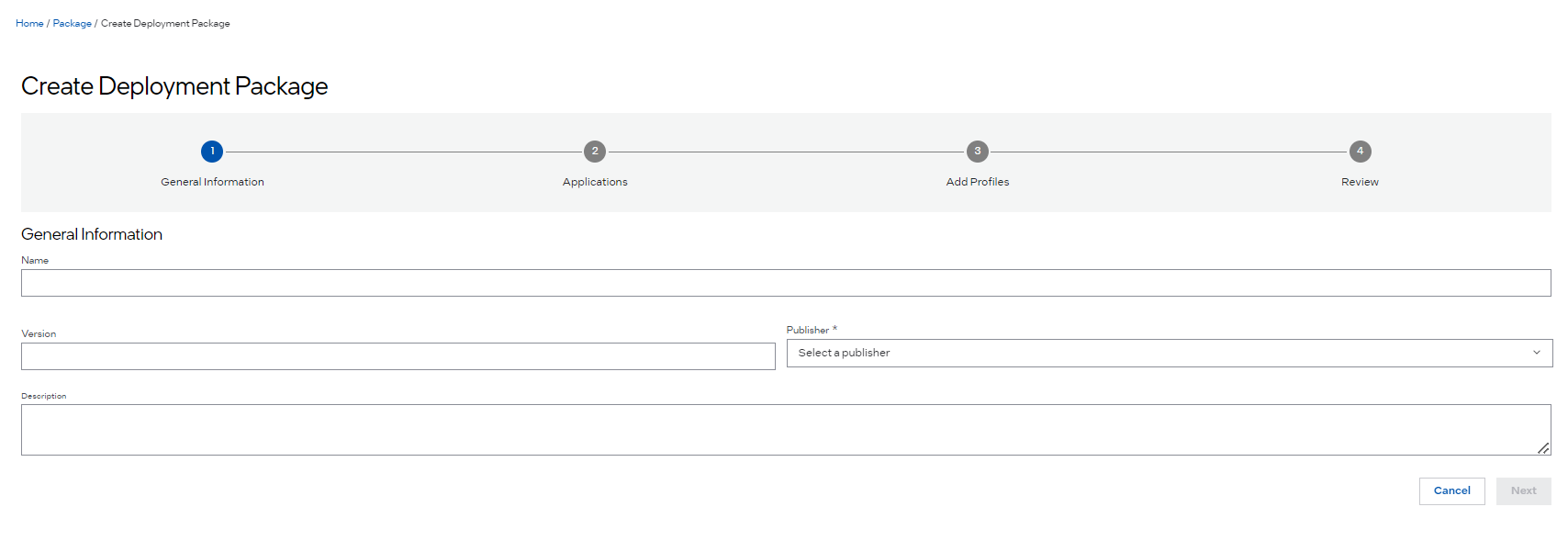 On the Create Deployment Package page, enter the following information about the deployment package: