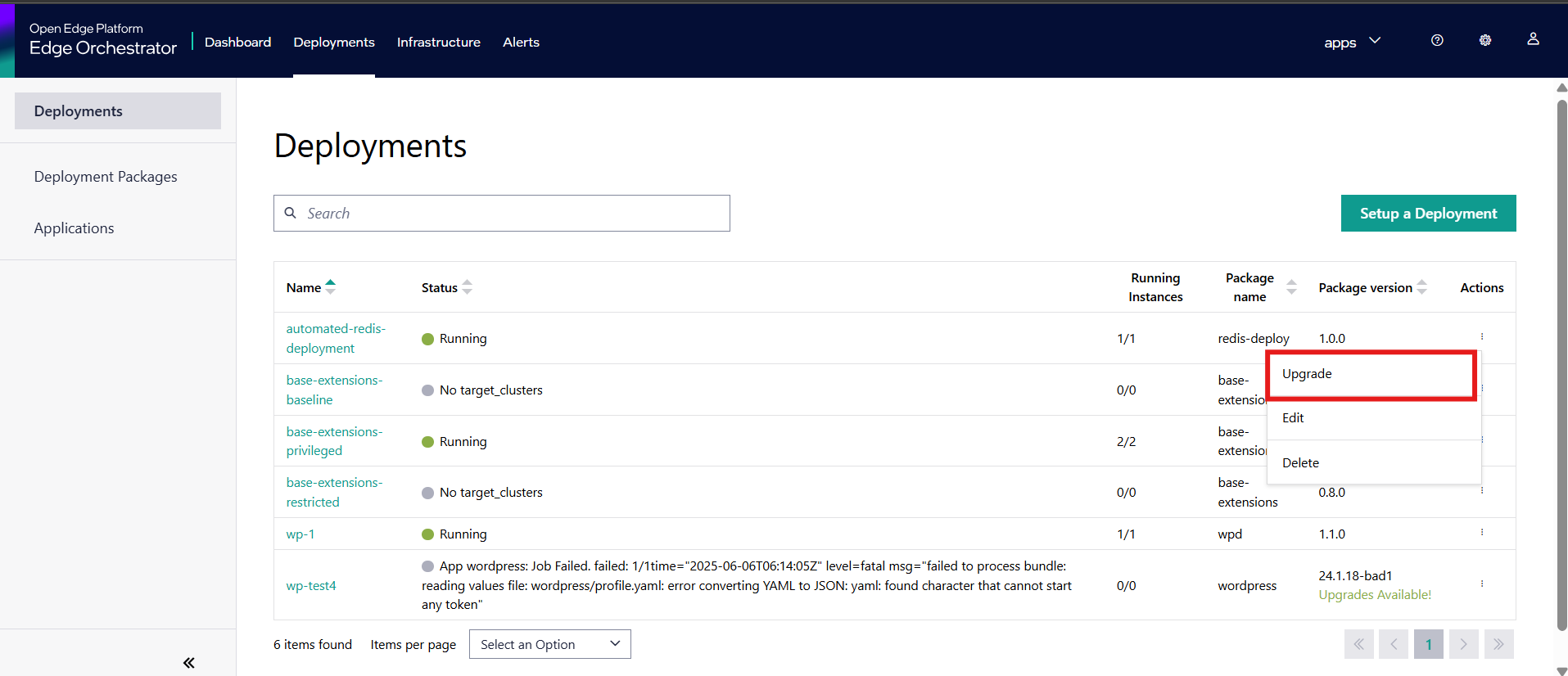 In the Deployments page, select the deployment setup where an upgrade is available.