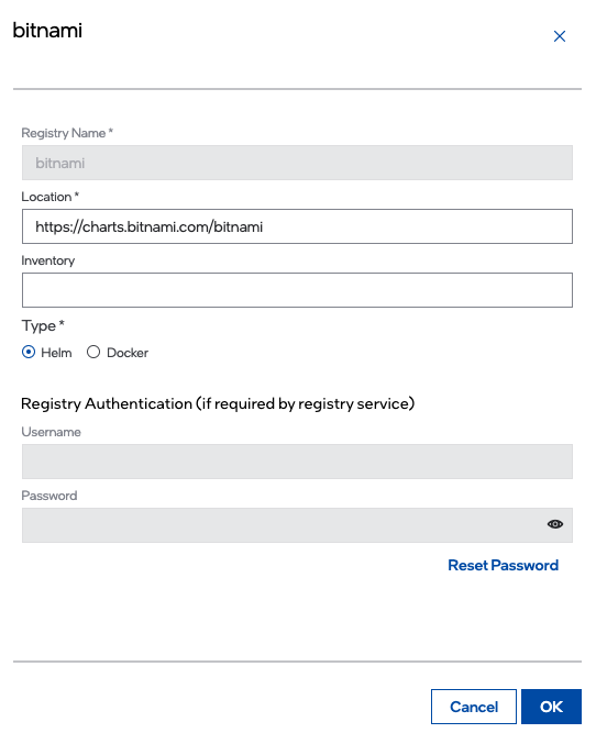 To update registry credentials, click the Reset Password button and enter the new Username and Password. The Password may be the actual password or an authentication token.
