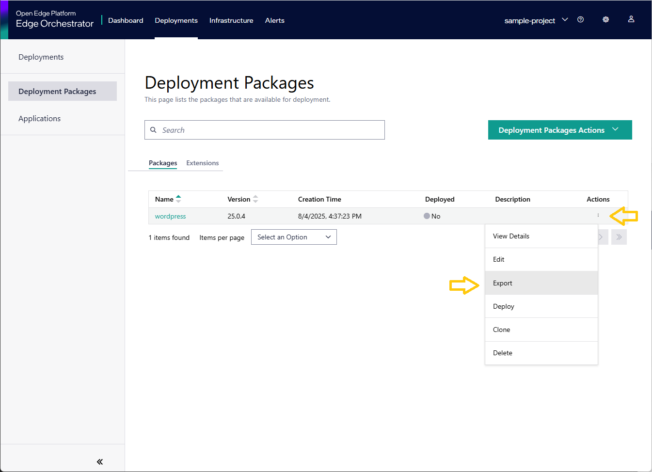 In the Deployment Package page, find the package you are interested in and expand the Actions. Then click the Export button in the dropdown action list: