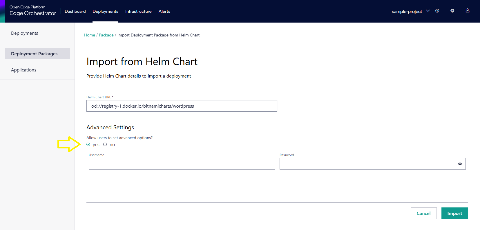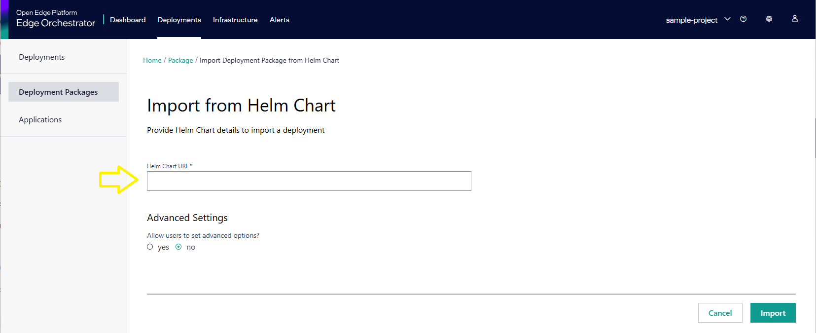 The Import Helm Chart feature allows you to specify the URL of an OCI helm chart, and Edge Manageability Framework will automatically fetch that chart and create a deployment package for you. This feature is most useful for relatively simple helm charts that have few values that need to be configured, though with some additional work, you can customize values to support even complex charts.