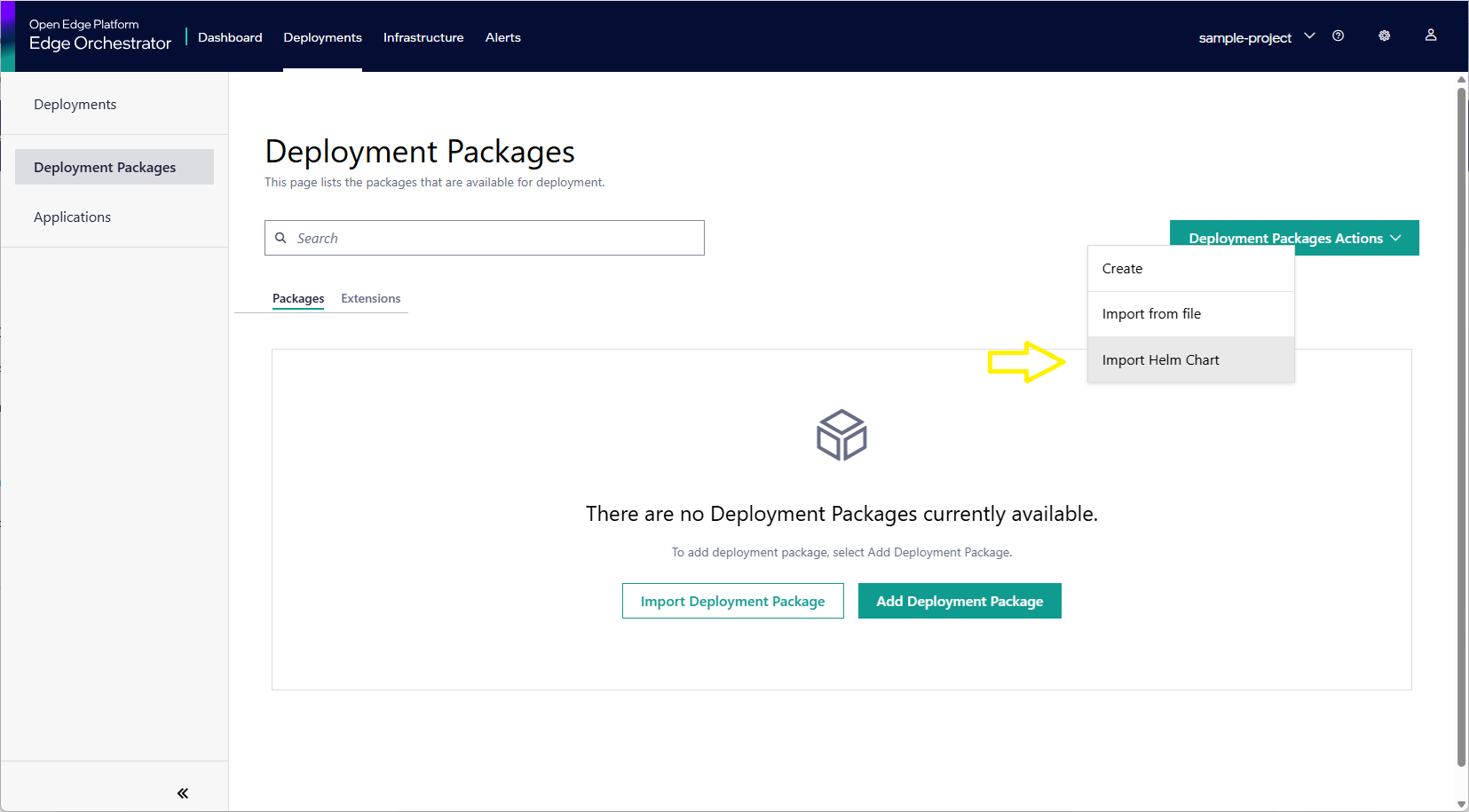 1. In the Deployment Package page, click Deployment Package Actions. This will open a drop-down. Select Import Helm Chart.