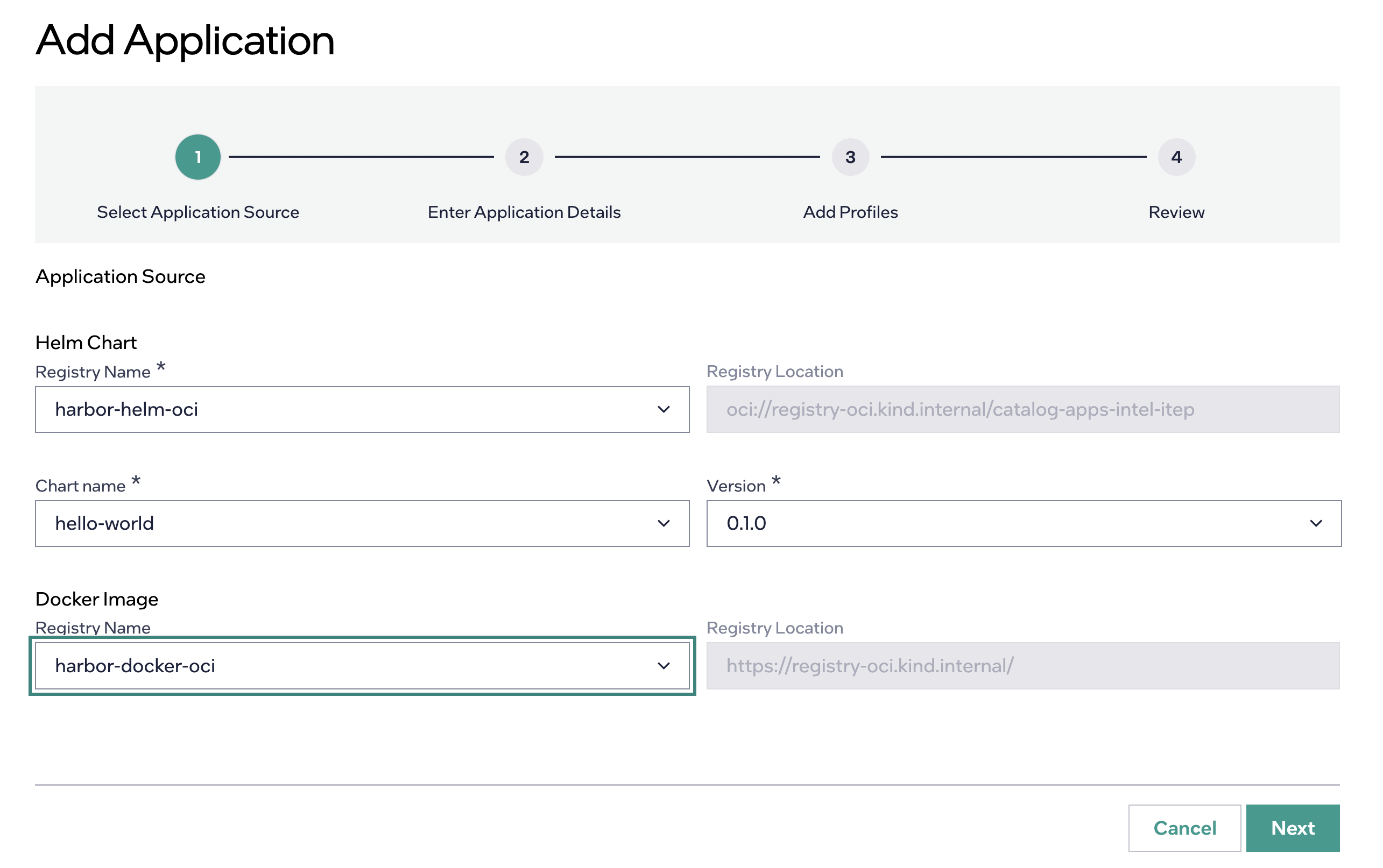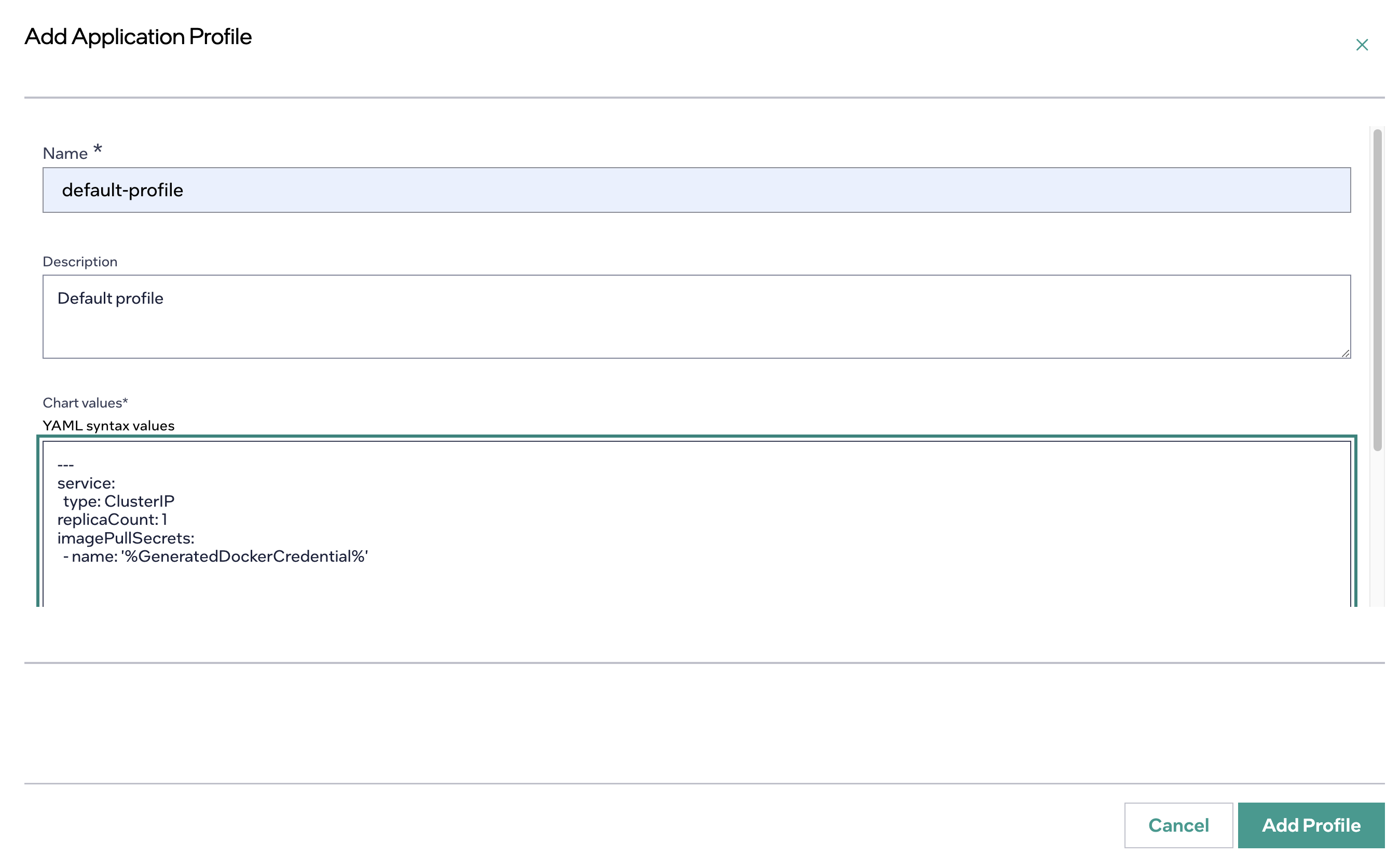 Click Next and then click Add Profile. A profile is where you can specify parameter templates for the Helm chart. Enter: