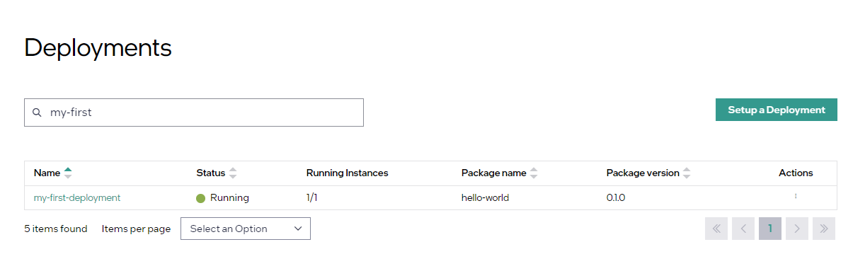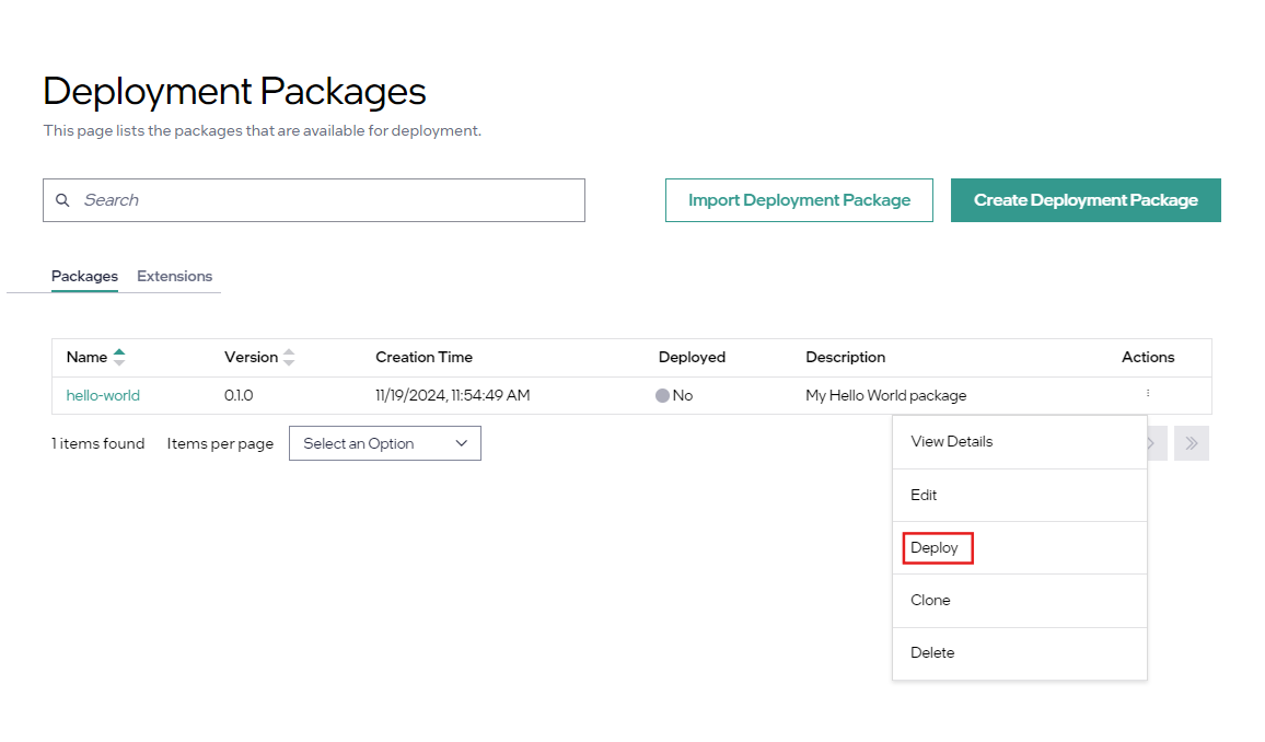 Click on the three-dot-button to the right of the “hello-world” Deployment Package and select Deploy: