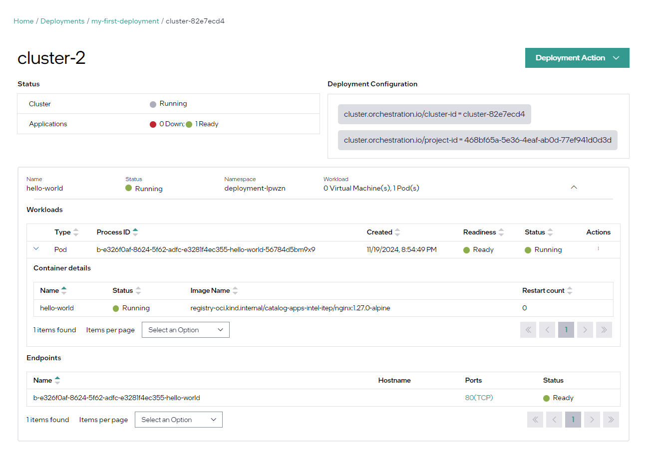 Click “my-first-deployment” to drill down into the deployment details. You will see that the application is running on the selected cluster. Click the Cluster ID to drill down into the cluster view: