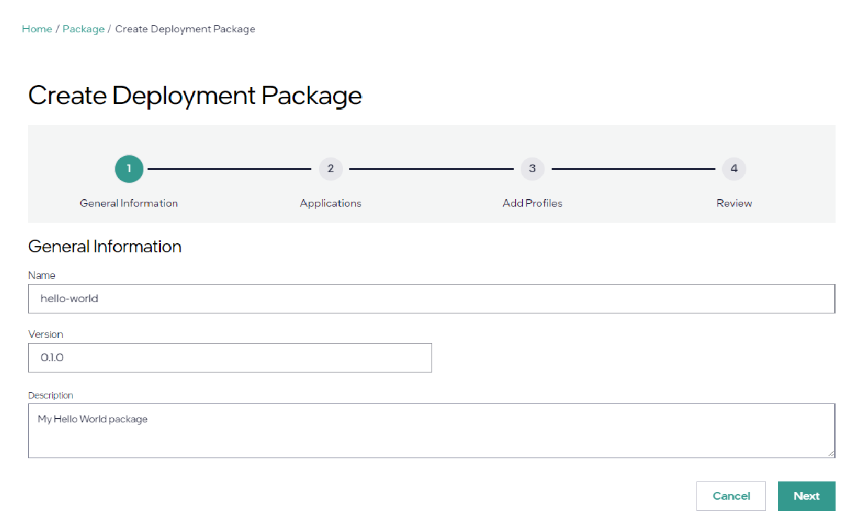 Click Next twice, and then click Add Deployment Package. You will return to the Deployment Packages page and you will see “hello-world” in the list.