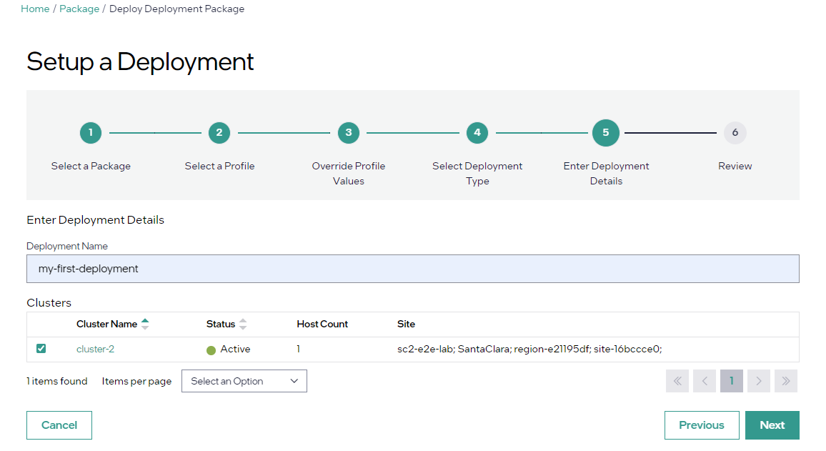 For deployment name, enter “my-first-deployment”. Then choose a target cluster from the list and click Next.