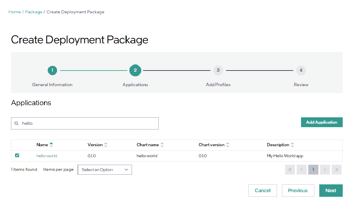 Click Next. On the next screen, select the “hello-world” application: