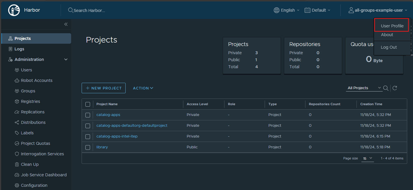 https://registry-oci.<CLUSTER_FQDN>using your Edge Manageability Framework IAM credentials. You must be in the Edge-Manager-Group for your project, to access the registry. See Edge Orchestrator Groups and Roles for details.Access User Profile at top right:
