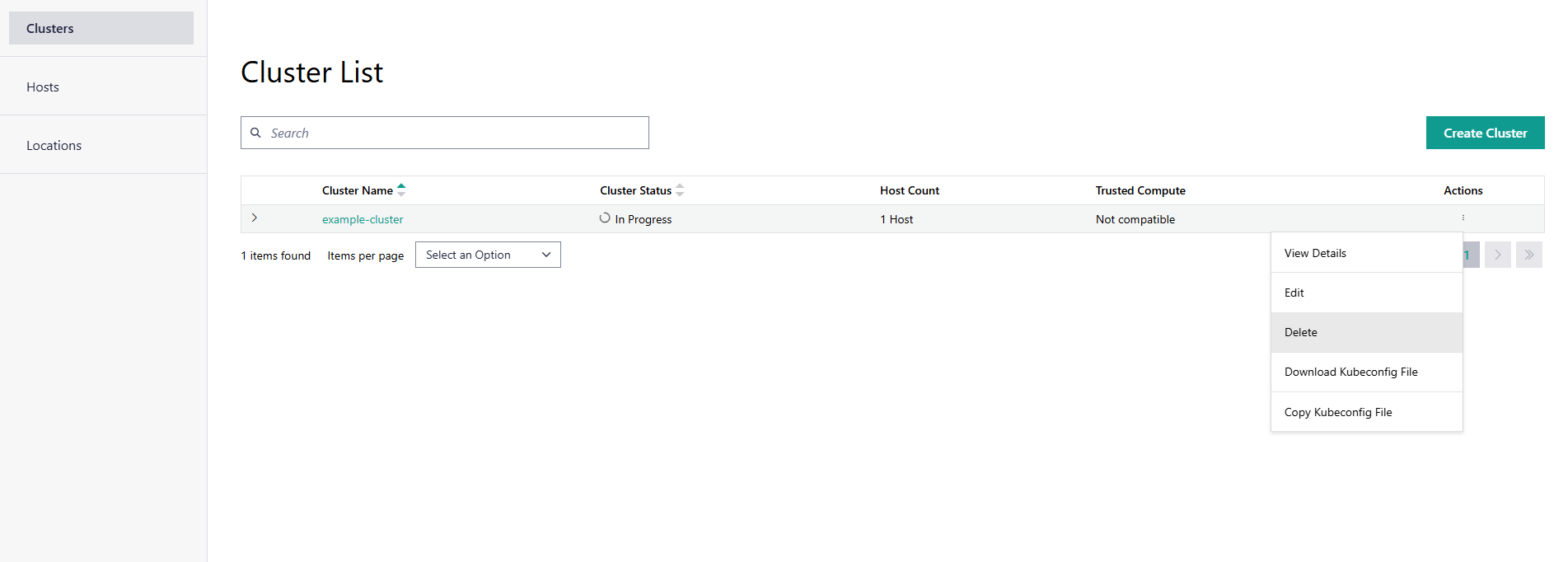 Click the three-dot (…) icon in the Actions column for the desired cluster and select Delete.
